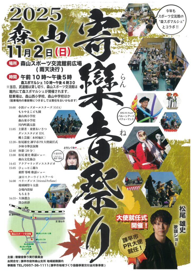 「森山よらんね祭り」は、郷土芸能や歌謡ショー、ダンスステージ、地元農産物の販売、ニュースポーツ体験、紅白餅まき、大抽選会など、地域の魅力が詰まったイベントです。今年は諫早市出身の歌手・松尾雄史さんによる「諫早市PR大使就任式」も行われ、さらに盛り上がりを見せる予定です。