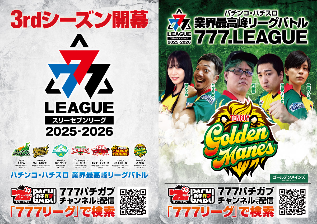 株式会社テンガイは、パチンコホール法人対抗の実戦バトルリーグ「777.LEAGUE(スリーセブンリーグ)」の2025–2026シーズン(3rdシーズン)に参戦しております。